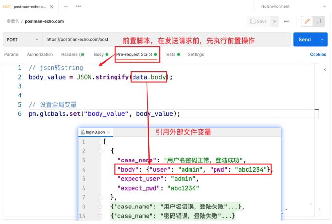 3. 请求体参数化:通过Pre-request Scrip预处理